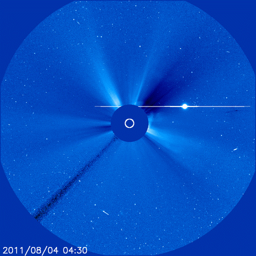 Moving at an estimated speed of 1950 km/s, this CME is expected to sweep up an earlier CME already en route. Analysts at the GSFC Space Weather Lab say the combined-CME should reach Earth on August 5th at 10:00 UT plus or minus 7 hours: "The impact on Earth is likely to be major. The estimated maximum geomagnetic activity index level Kp is 7 (Kp ranges from 0 - 9). The flanks of the CME may also impact STEREO A, Mars and Mercury/MESSENGER." High-latitude sky watchers should be alert for auroras.