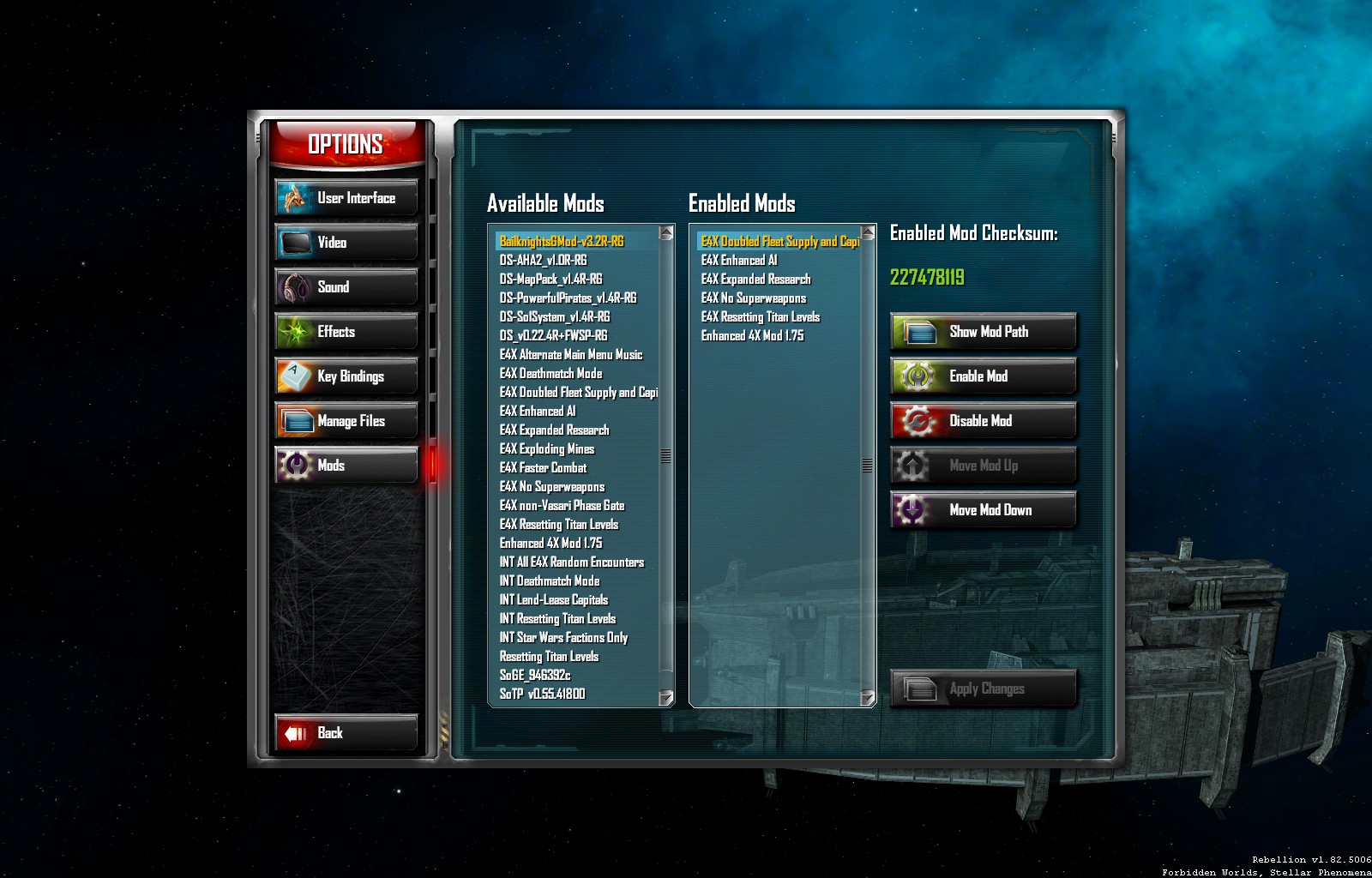 Oh my its been awhile and I seem to have lost my marbles.  I forgot what checksum number EX4 + a few of the mods have to be or is it main mod first then minins after and checksum will vary since I am using a few select mods.  At any rate saw your new rig on moddb.  Looks pretty hot.  How do these mods run now that you have a better PC?