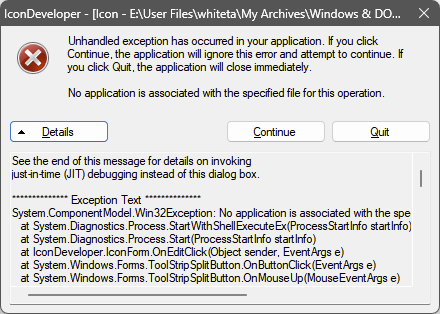 Hi all. I have just recently purchased IconDeveloper as I wanted to work on some Icons. My selected Icon loads and displays correctly, but when clicking on the 'Edit' button the program crashes with an Unhandled Exception.