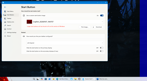 When use custom start button image, it aligns taskbar to the Center, and its showing Left Aligned.