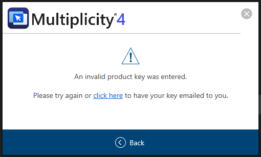 I didn't realize upgrading multiplicity this morning would entail an hour plus of downtime. After the install completed and did the required reboot, always fun to shut everything down. The primary computer insists it's a secondary now and I need to activate in order to reconfigure the system that was running just fine before the upgrade. I am getting this screen using the product key that was emailed to the address I am using in the activation dialog.