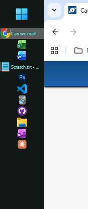 I've selected the 'extra large' option and made my buttons and icons small, but I still see just a few letters of each open file name. I'd really like a wider taskbar so I can read much more of the file names for when I have several different files open in the same app, such as multiple text files. In Windows 10 we could drag it to whatever width we wanted, reconfiguring it to the task at hand. Ideally, it would be nice to get that level of functionality back, but at least the ability to control the width through a setting would be very helpful.