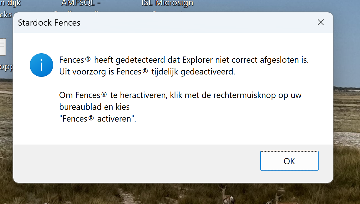 I got the message "explorer was not closed properly and therefore fences was deactivated. Press right mouse butto and activate". After done that the fences show up shortly and it disappear again following with the same message. I uninstalled fences and installed it again. Also with the purge of Stardock. My laptop is connected to the intranet through a dockingstation and I am running display fusion as well.