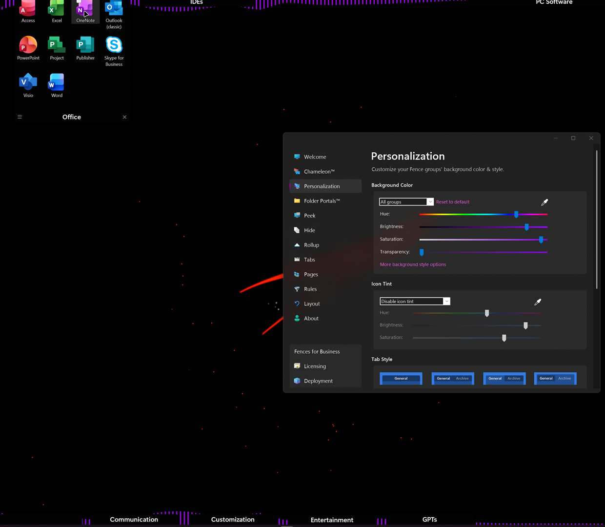 Hi! I want my Fences to have a transparent background (at least, to some extend). But when I move the slider all to the left, the fences just go darker, without becoming transparent (check the photo below, I know it's the dark on dark, but that purple visualizer from Wallpaper Engine should be visible on the Fence, and it isn't, both up and down). I tried with saturation and brightness as well, but the Fence is just getting darker but still solid